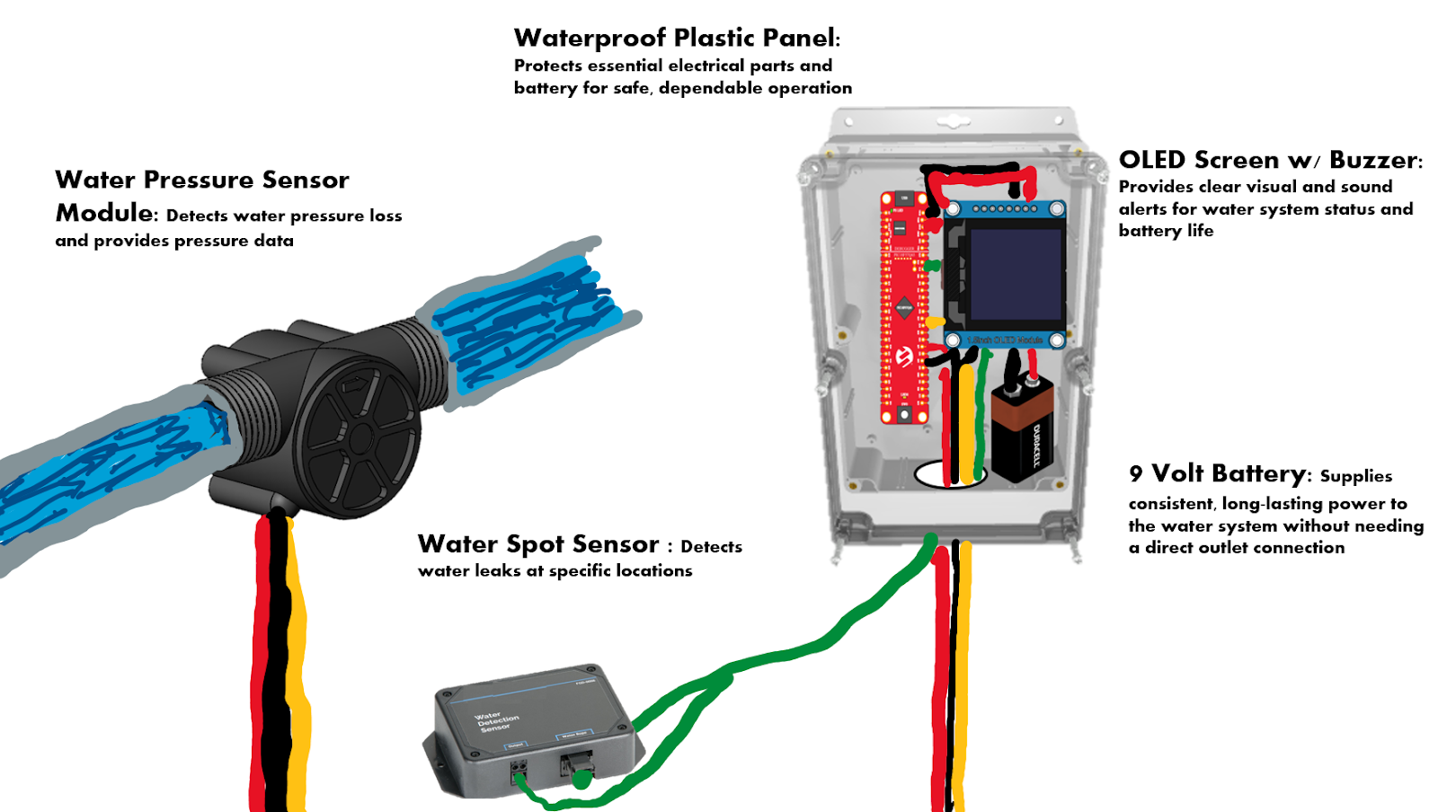 Primary Choice – Concept 1: Water pressure sensing & spot leak sensor with external box, 9V battery pack powered, buzzer alarm via OLED Panel.