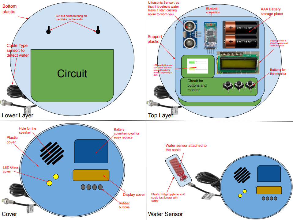 Second Choice – Concept 2: Plastic, Polypropylene, water sensor, Ultrasonic, Bluetooth, AAA Battery, LED, light sensor, Cable-Type sensor, Buttons, waterproof circuit.