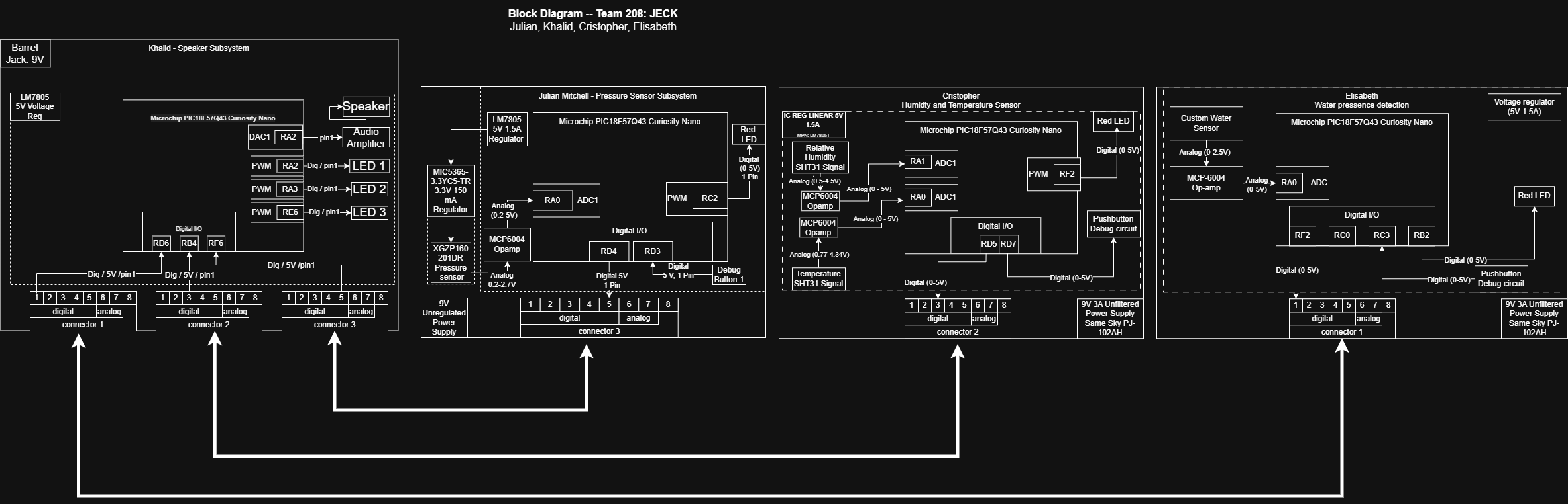 This page showcases the team's subsystems designed and built by each team member, which together form a complete, coordinated water detection system. Each teammate has developed a standalone subsystem using a Microchip PIC18F57Q43 Curiosity Nano as the microcontroller, and each subsystem is designed to perform a distinct sensing or actuation function.