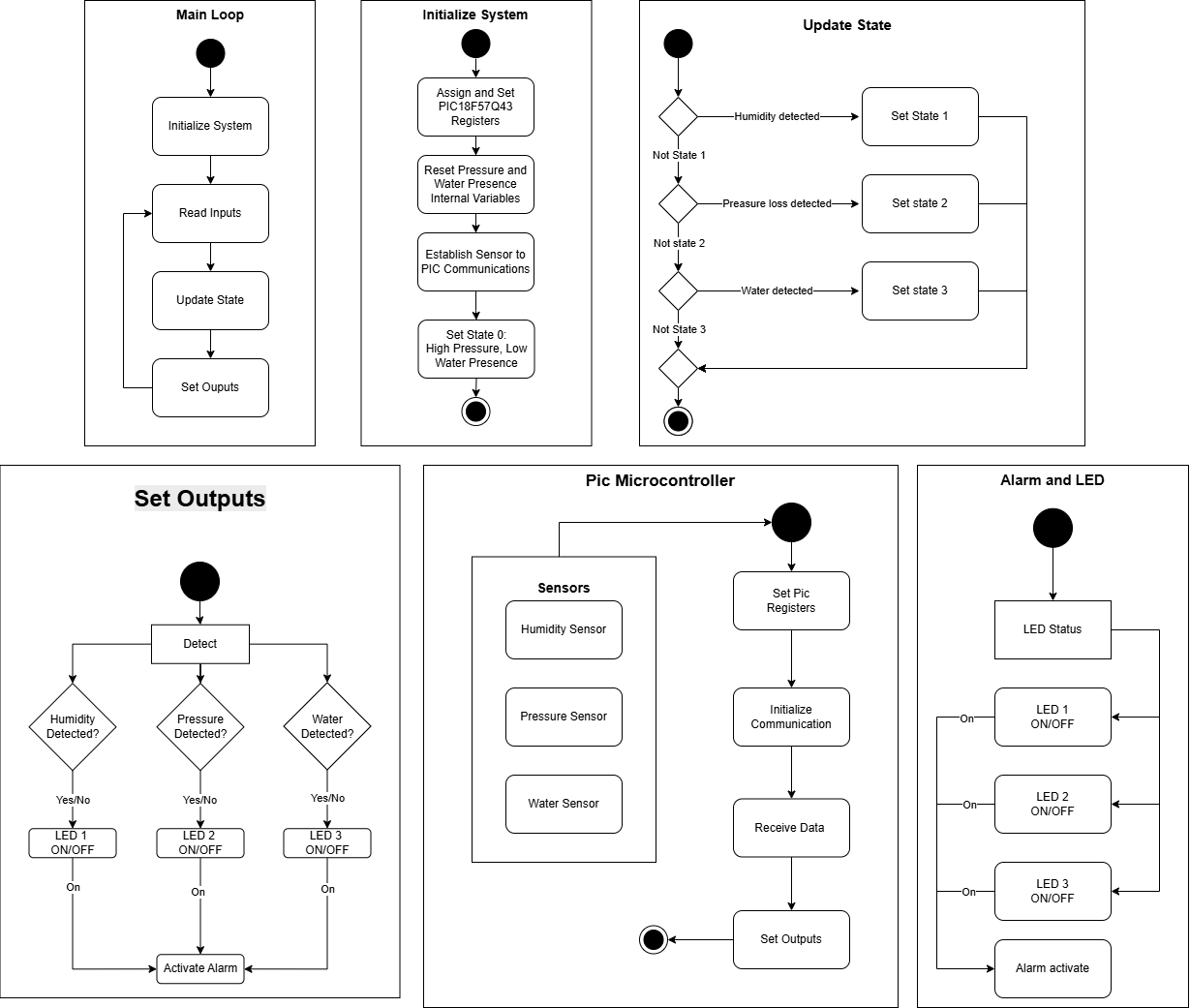 The diagram illustrates the core operation of the Water Detection Subsystem. The system runs in a continuous loop, initializing the PIC18F57Q43 microcontroller, reading sensor inputs, updating states based on humidity, pressure loss, or water detection, and setting outputs accordingly. Each detection condition activates its corresponding LED indicator.